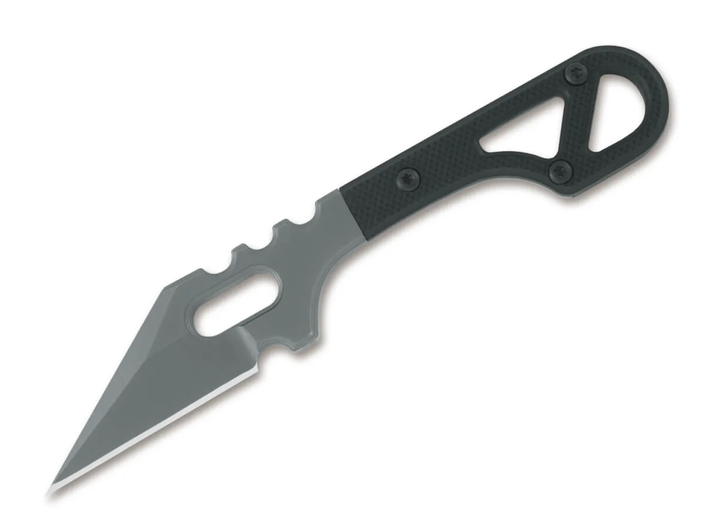 Das Neck Nnife Spike von BlackFox mit spitzer Wharncliffe-Klinge aus 440C überzeugt durch geringes Gewicht und exzellente Griffigkeit. Ermöglicht wird beides durch den stark skelettierten G10-Griff und das große Langloch in der Klinge sowie die Daumenauflage mit drei großen Innenradien. Ungewöhnlich für diese niedrige Gewichtsklasse ist die Scheide, die gleichzeitig zur Verwendung des Messers als Neckknife oder als Gürtelmesser ausgelegt ist.