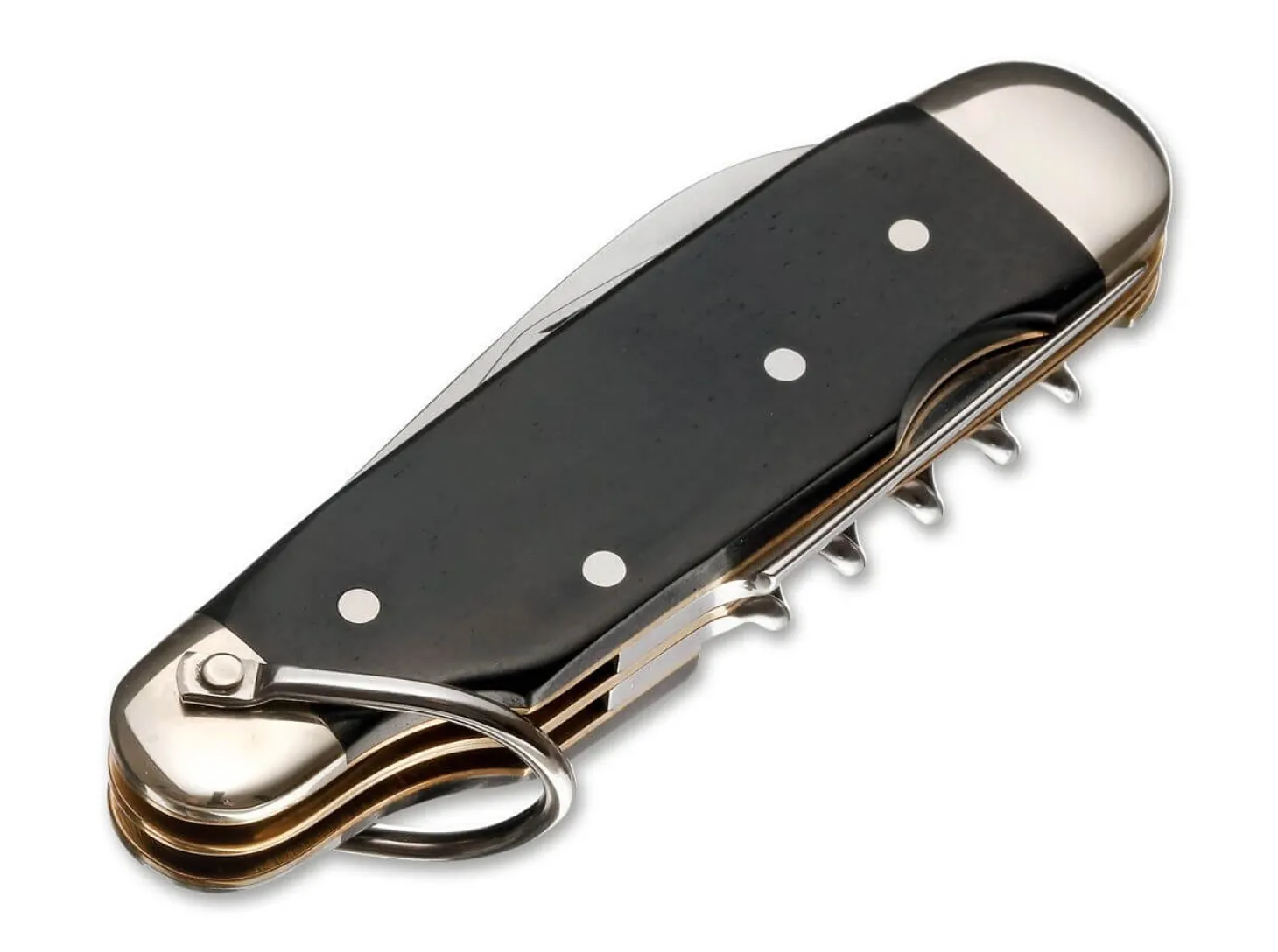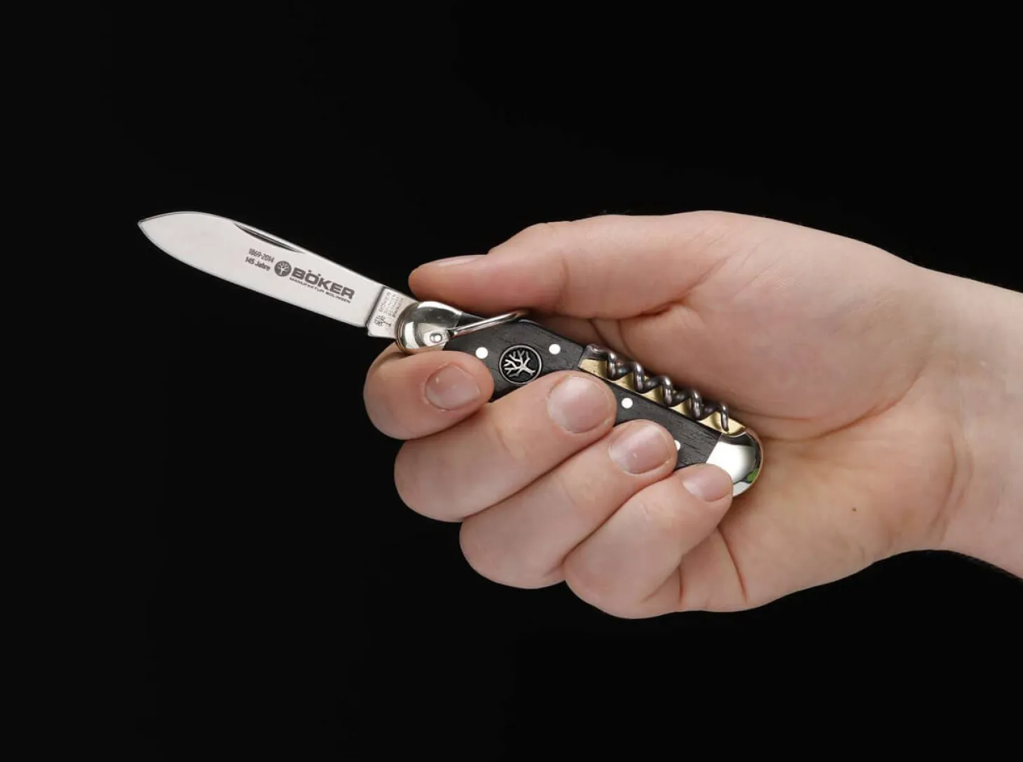 Das sechsteilige Böker Sportmesser wird bereits seit 1869 in unserer Solinger Manufaktur von Hand gefertigt. Das im Laufe der Geschichte vielfach kopierte Konzept vereint zahlreiche nützliche Werkzeuge in einem hochwertigen Taschenmesser. Es befindet sich länger in Produktion, als jedes andere Multifunktionsmesser. Und solange Böker in Solingen Messer fertigt, solange werden wir auch diesen Klassiker herstellen.Das Sportmesser verrät sich auf den ersten Blick durch seine unverwechselbare Form. Selbst in geschlossenem Zustand erkennt man bereits drei typische Elemente des praktischen Modells: Die polierten Neusilber-Backen vorn und hinten, der Bügel zum Montieren eines Karabinerhakens für Kette oder Riemen und die Verjüngung des Griffrückens vorn, also im Bereich der Hauptklingen-Angel. Die so entstehende sanfte Halbmulde bildet eine perfekte Auflage für den Daumen, wenn man das Messer zum Schneiden in der Hand hält. Das traditionelle Design ist vollkommen westentaschentauglich und bietet klare praktische Vorteile. Für das Ausfahren der Instrumente braucht man immer zwei Hände, die Klingen sind nicht feststellbar. Stattdessen halten die klassischen Stützfedern das Messer geöffnet.Ausgestattet ist es mit zwei Klingen, einem Dosen- und Flaschenöffner, einer Stech- und Reibahle sowie einem Korkenzieher und einem Schlitzschraubendreher. Beide Klingen werden aus 4034er Stahl gefertigt, dem klassischen Solinger Klingenstahl, der Korrosionsresistenz, Schnitthaltigkeit und leichte Nachschärfbarkeit miteinander verbindet. Die Jubiläumsversion des Urgesteins unserer Modellpalette hat polierte Neusilber-Backen und Schalen aus edlem zertifiziert importiertem Ebenholz mit einem eingelassenem Jubiläumsemblem aus rhodiniertem Sterling Silber. Dank des praktischen Fangriemenbügels kann das Messer einfach an Taschen oder anderen Gegenständen befestigt werden. Lieferung in spezieller Jubiläumsverpackung und mit Echtheitszertifikat. Limitiert auf 1869 Exemplare weltweit.