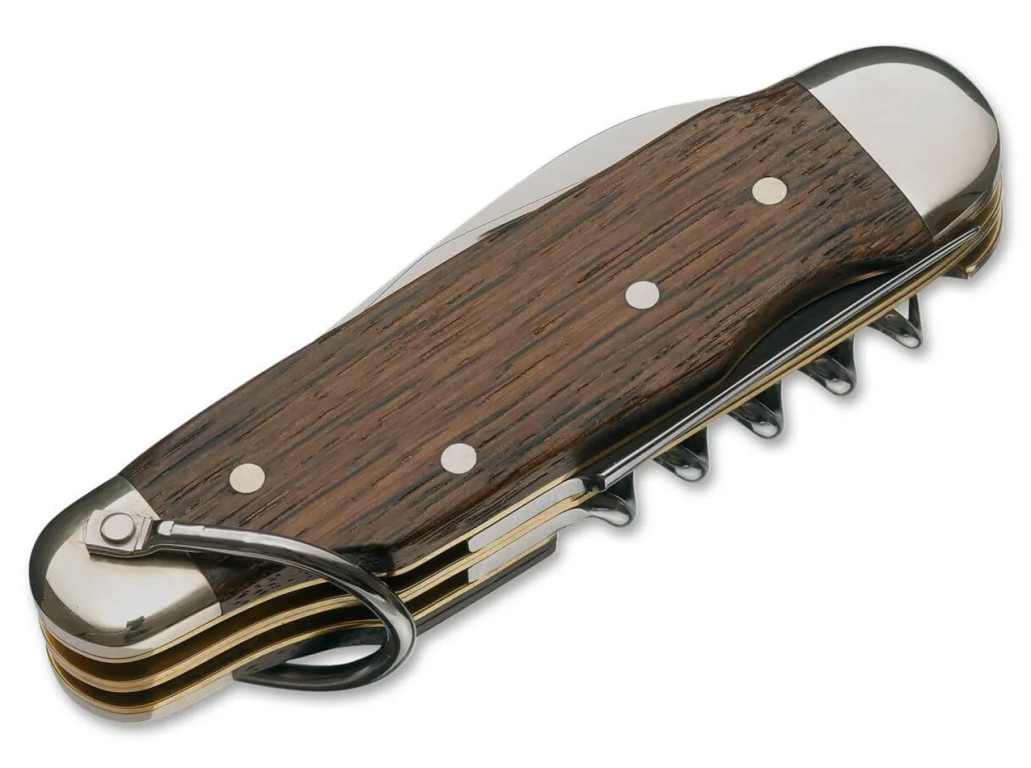 Das sechsteilige Böker Sportmesser wird bereits seit 1869 in unserer Solinger Manufaktur von Hand gefertigt. Das im Laufe der Geschichte vielfach kopierte Konzept vereint zahlreiche nützliche Werkzeuge in einem hochwertigen Taschenmesser. Es befindet sich länger in Produktion, als jedes andere Multifunktionsmesser. Und solange Böker in Solingen Messer fertigt, solange werden wir auch diesen Klassiker herstellen.Das Sportmesser verrät sich auf den ersten Blick durch seine unverwechselbare Form. Selbst in geschlossenem Zustand erkennt man bereits drei typische Elemente des praktischen Modells: Die polierten Neusilber-Backen vorn und hinten, der Bügel zum Montieren eines Karabinerhakens für Kette oder Riemen und die Verjüngung des Griffrückens vorn, also im Bereich der Hauptklingen-Angel. Die so entstehende sanfte Halbmulde bildet eine perfekte Auflage für den Daumen, wenn man das Messer zum Schneiden in der Hand hält. Das traditionelle Design ist vollkommen westentaschentauglich und bietet klare praktische Vorteile. Für das Ausfahren der Instrumente braucht man immer zwei Hände, die Klingen sind nicht feststellbar. Stattdessen halten die klassischen Stützfedern das Messer geöffnet.Ausgestattet ist es mit zwei Klingen, einem Dosen- und Flaschenöffner, einer Stech- und Reibahle sowie einem Korkenzieher und einem Schlitzschraubendreher. Beide Klingen werden aus 4034er Stahl gefertigt, dem klassischen Solinger Klingenstahl, der Korrosionsresistenz, Schnitthaltigkeit und leichte Nachschärfbarkeit miteinander verbindet. Das Urgestein unserer Modellpalette hat polierte Neusilber-Backen und strapazierfähige Schalen aus dunklem heimischen Eichenholz. Das Holz der Bergischen Eiche, das für den Einsatz als Griffschale geräuchert wird, verleiht dem Messer seinen unvergleichlichen Charakter und verfügt zudem noch über eine Portion Lokalkolorit. Dank des praktischen Fangriemenbügels kann das Messer einfach an Taschen oder anderen Gegenständen befestigt werden. Die Auslieferung erfolgt mit einem hochwertigen Filzetui und einer Stülpdeckelverpackung.