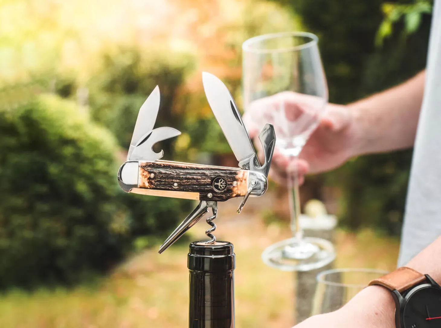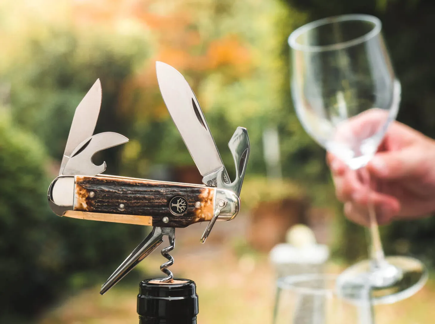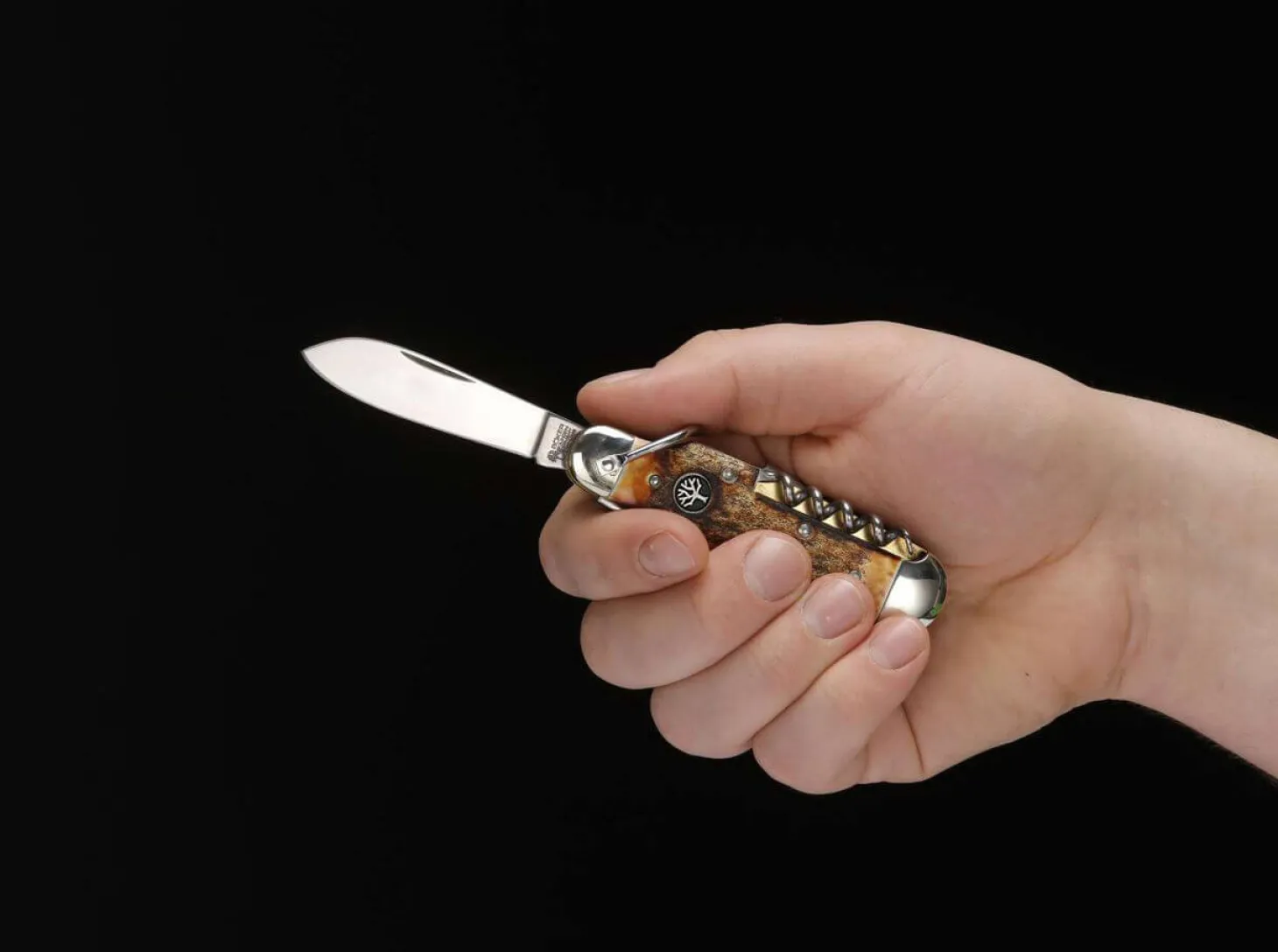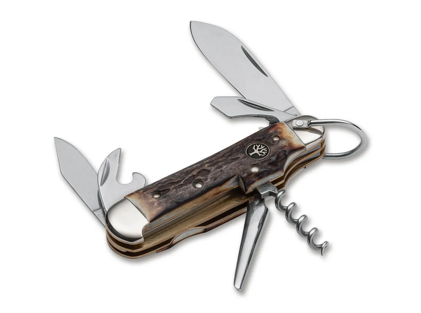 Das sechsteilige Böker Sportmesser wird bereits seit 1869 in unserer Solinger Manufaktur von Hand gefertigt. Das im Laufe der Geschichte vielfach kopierte Konzept vereint zahlreiche nützliche Werkzeuge in einem hochwertigen Taschenmesser. Es befindet sich länger in Produktion, als jedes andere Multifunktionsmesser. Und solange Böker in Solingen Messer fertigt, solange werden wir auch diesen Klassiker herstellen.Das Sportmesser verrät sich auf den ersten Blick durch seine unverwechselbare Form. Selbst in geschlossenem Zustand erkennt man bereits drei typische Elemente des praktischen Modells: Die polierten Neusilber-Backen vorn und hinten, der Bügel zum Montieren eines Karabinerhakens für Kette oder Riemen und die Verjüngung des Griffrückens vorn, also im Bereich der Hauptklingen-Angel. Die so entstehende sanfte Halbmulde bildet eine perfekte Auflage für den Daumen, wenn man das Messer zum Schneiden in der Hand hält. Das traditionelle Design ist vollkommen westentaschentauglich und bietet klare praktische Vorteile. Für das Ausfahren der Instrumente braucht man immer zwei Hände, die Klingen sind nicht feststellbar. Stattdessen halten die klassischen Stützfedern das Messer geöffnet.Ausgestattet ist es mit zwei Klingen, einem Dosen- und Flaschenöffner, einer Stech- und Reibahle sowie einem Korkenzieher und einem Schlitzschraubendreher. Beide Klingen werden aus 4034er Stahl gefertigt, dem klassischen Solinger Klingenstahl, der Korrosionsresistenz, Schnitthaltigkeit und leichte Nachschärfbarkeit miteinander verbindet. Das Urgestein unserer Modellpalette hat polierte Neusilber-Backen und strapazierfähige Schalen aus echtem Hirschhorn. Dank des praktischen Fangriemenbügels kann das Messer einfach an Taschen oder anderen Gegenständen befestigt werden.