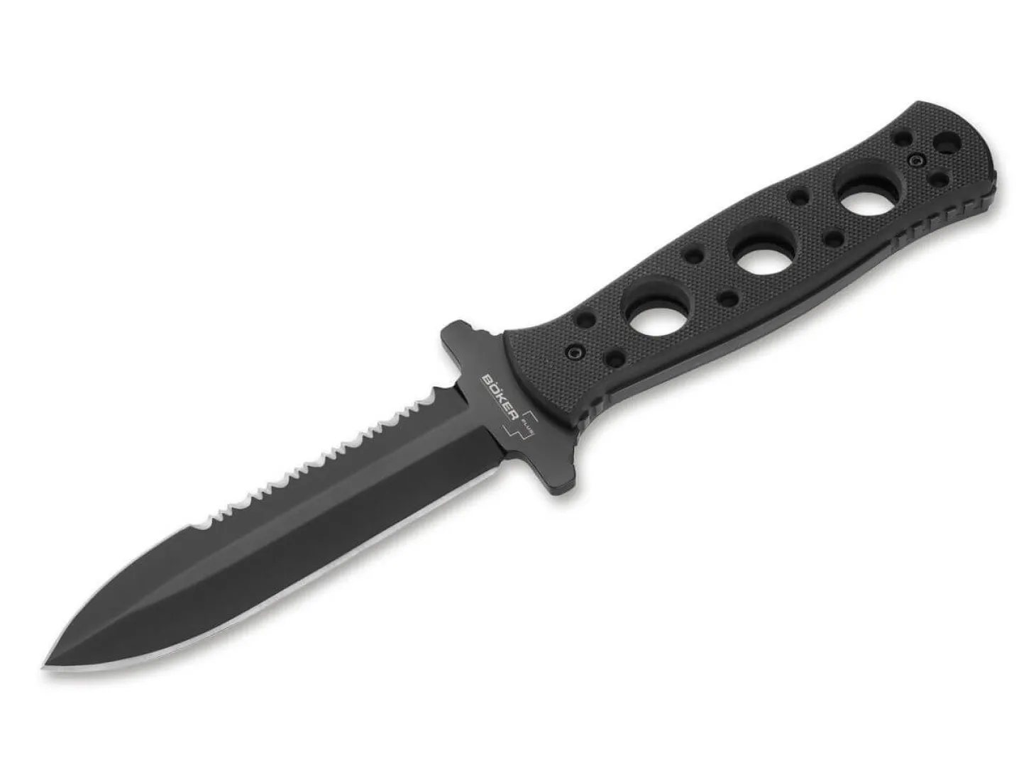Das Böker Plus Steel-Mariner eignet sich perfekt für den maritimen Einsatz. Die Klinge des Tauchermessers besteht aus rostfreiem 440C und ist komplett titanbeschichtet, was die Korrosionsbeständigkeit nocheinmal deutlich erhöht. Die obere Schneide verfügt über einen sehr effektiven großflächigen Wellenschliff zum raschen Trennen von Seilen, Netzen und anderen Gewebematerialien. Die untere Schneide ist für präzises und feines Schneiden durchgehend glatt geschliffen. Die griffigen G10-Schalen liegen sehr gut und rutschsicher in der Hand, und die Fangriemenöse schützt das Messer vor Verlust. Ausgeliefert wird das Böker Plus Steel-Mariner mit einer hochwertigen Kydex-Scheide und einem passenden Gürteladapter.
