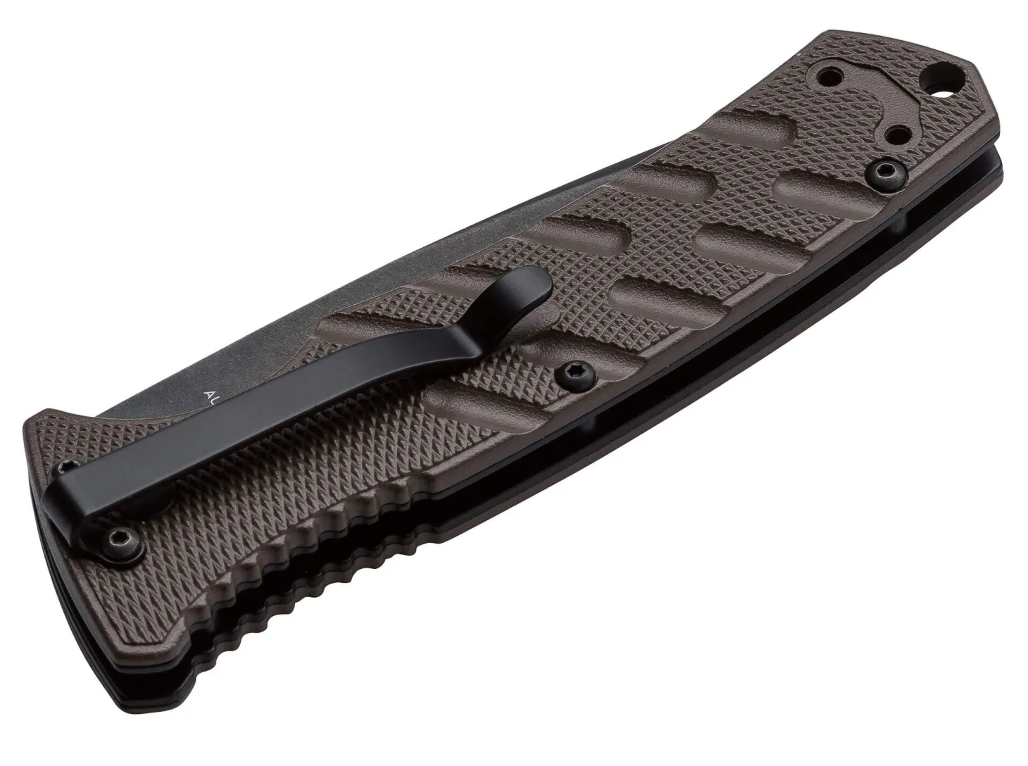 Hinweis: Seit dem 31.10.2024 gilt in Deutschland ein generelles Umgangs- und Besitzverbot von Springmessern aller Art. Es handelt sich ab sofort um verbotene Gegenstände, deren Besitz strafbar ist. Der Besitz von bestimmten Springmessern ist gem. Anlage 2 zum Waffengesetz Abschnitt 1 Nummer 1.4.1 nur noch Personen erlaubt, bei denen ein berechtigtes Interesse besteht, das eine einhändige Nutzung erforderlich macht (etwa aufgrund eines fehlenden Arms oder einer fehlenden bzw. dysfunktionalen Hand), oder der Umgang im Zusammenhang mit der Berufsausübung (z.B. Jagd, Handwerk) oder dem Sport (z.B. Segeln oder Bergsteigen) erfolgt. Gleiches gilt für gewerbliche Händler oder Hersteller solcher Messer. Die Abgabe erfolgt daher nur noch an berechtigte Personen. Bitte prüfen Sie vor der Bestellung, ob ein solches berechtigtes Interesse bei Ihnen vorliegt.Das Böker Plus Strike rundet als robustes Springmesser für den Alltag oder Einsatz unser breites Programm an Automatikmessern ab. Der schlanke, ergonomisch geformte Griff baut auf soliden Stahlplatinen auf, die mit griffig gefrästen und leichtgewichtigen Schalen aus coyotefarbenem Aluminium bestückt sind. Das vergleichsweise weiche und zähe Metall weist gleichzeitig eine hohe Festigkeit auf und ist sehr belastbar. Tiefe Rillen in der ausgeprägten Daumenmulde unterstützen zudem die sichere Handlage. Dank der sauber rastenden Schiebesicherung kann das geschlossene Messer zusätzlich verriegelt und ein versehentliches Auslösen verhindert werden. Durch das Betätigen des Knopfes wird die Klinge freigegeben, durch die Spannung der dahinterliegenden Feder klappt sie dann selbstständig auf. Die Droppoint-Klinge wird aus dem in Japan entwickeltem AUS-8 gefertigt und ist mit einem dunklen Stonewash-Finish versehen. Auf der Rückseite befindet sich ein umsetzbarer Clip (Tip-up/Tip-down). Mit hochwertigem Nylon-Etui zur Aufbewahrung.