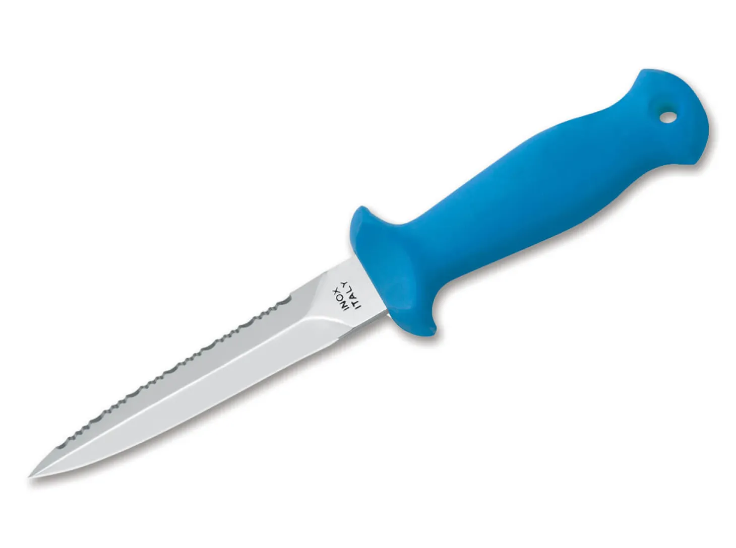 Das professionelle Tauchermesser Sub 11 D von MAC ist mit einer Dolchklinge aus 4116 ausgestattet, die zusätzlich über einen bissigen Wellenschliff verfügt. Der blaue Griff aus rutschfestem TPE liegt auch unter Wasser sicher in der Hand. Lieferung mit PE-Scheide mit Gummibändern für Beine oder Arme.