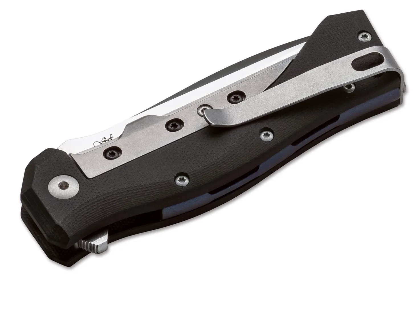 Das Ten nach dem Design von Fabrizio Silvestrelli besticht nicht nur durch seine aufregende Linienführung und die perfekte Handlage, sondern auch durch eine hochinteressante Bauweise: Die Hybridfeder, die als Weiterentwicklung des Linerlock die Klinge verriegelt, ist zweiteilig aufgebaut. Der eigentliche federnde Teil wird aus Titan gefertigt und trägt vollflächig ein gefrästes Stahl-Overlay, das auch den Kontakt zur Klingenwurzel übernimmt. Durch die einstellbare Verschraubung dieser beiden Komponenten kann auch langfristig eventueller Verschleiß dieser Bauteile kompensiert werden, was ein Garant für maximale Langlebigkeit ohne jede Spur von Klingenspiel ist. Auch das Distanzstück im Griff wird aus dreidimensional gefrästem und blau anodisierten Titan gefertigt. Die satinierte Klinge besteht aus N690 und wird per Flipper geöffnet. Der umsetzbare Clip (l/r, Tip-up) vervollständigt die Ausstattung.