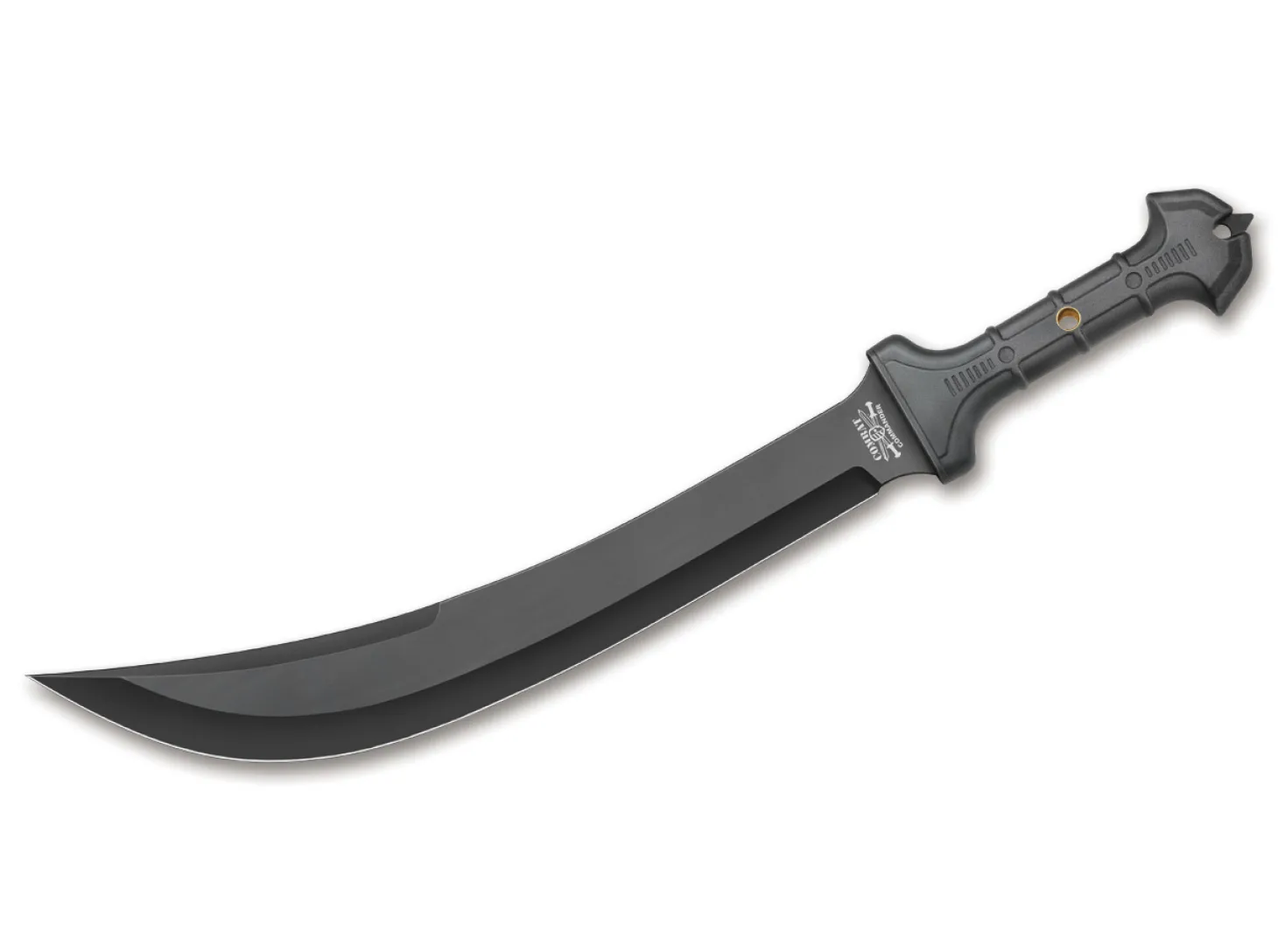 Das Thrax Gladius von United Cutlery beindruckt durch eine wuchtige, gebogene Klinge aus schwarz beschichtetem, schockelastischem 1065 Kohlenstoffstahl. Die vollständig durch den strukturierten TPR-Gummigriff im römischen Gladius-Stil laufende Angel ist am Ende in einen Schlagdorn ausgeformt. Das Thrax Gladius kann sicher in der mitgelieferten verstärkten Nylonscheide transportiert werden.
