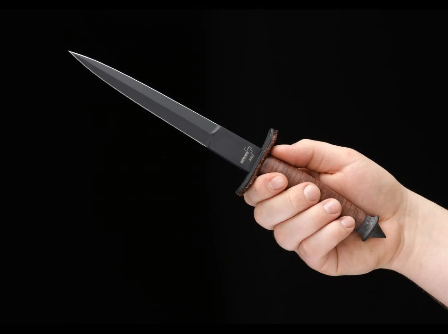 Im Juli 1942 wurde die Devil’s Brigade, die sogenannte Teufelsbrigade, ins Leben gerufen. Unter der offiziellen Bezeichnung 1st Special Service Force wurden amerikanische und kanadische Soldaten zu einer Spezialeinheit zusammengefasst, die speziell für den Kampf hinter den feindlichen Linien ausgebildet war. Die Wurzel vieler Spezialeinheiten nach dem zweiten Weltkrieg lässt sich bis zu dieser Einheit zurückverfolgen.Die vielen Nachtaktionen, für die wohl erstmals konsequent zur Tarnung alle Gesichter geschwärzt wurden, brachte ihnen bei der deutschen Wehrmacht auch den Spitznamen Schwarze Teufel ein, was vom großen Respekt des Gegners vor dieser relativ kleinen Einheit zeugt. Die 1st SSF brachte 1943-44 viele erfolgreiche Einsätze in Italien und Frankreich hinter sich und konnte für den Kriegsverlauf wichtige Situationen entscheidend beeinflussen.Ein wichtiger Ausrüstungsgegenstand der Devil’s Brigade war das speziell entworfene V-42 Kampfmesser, das auch Bestandteil des intensiven Nahkampftrainings war. Der Griff aus gepressten Lederscheiben läuft in einem spitz zulaufenden Schlagstück aus. Eine dünne Lederpolsterung unter dem leicht gebogenen Parierelement sollte Verletzungen beim Zustoßen verhindern.Die beschichtete Kohlenstoffstahlklinge aus SK5 ist beidseitig geschliffen und weist im Bereich des Ricasso eine geriffelte Daumenauflage auf. Noch heute ziert dieser legendäre Dolch das Wappen der Special Forces der US Army. Wir liefern dieses ausgesuchte Sammlerstück nicht nur mit der klassischen, tief sitzenden Lederscheide, sondern auch mit einer Replik des Textilabzeichens der Einheit, der roten Speerspitze, sowie mit einer Reproduktion des originalen, deutschsprachigen Aufklebers mit dem Text „Das dicke Ende kommt noch!“ samt 1st SSF-Abzeichen aus, der zur Demoralisierung nachts hinter den feindlichen Linien auf Wände, Autos, Mauern, Türen usw. geklebt wurde. Ein militärhistorisch sammelwürdiges Ensemble.