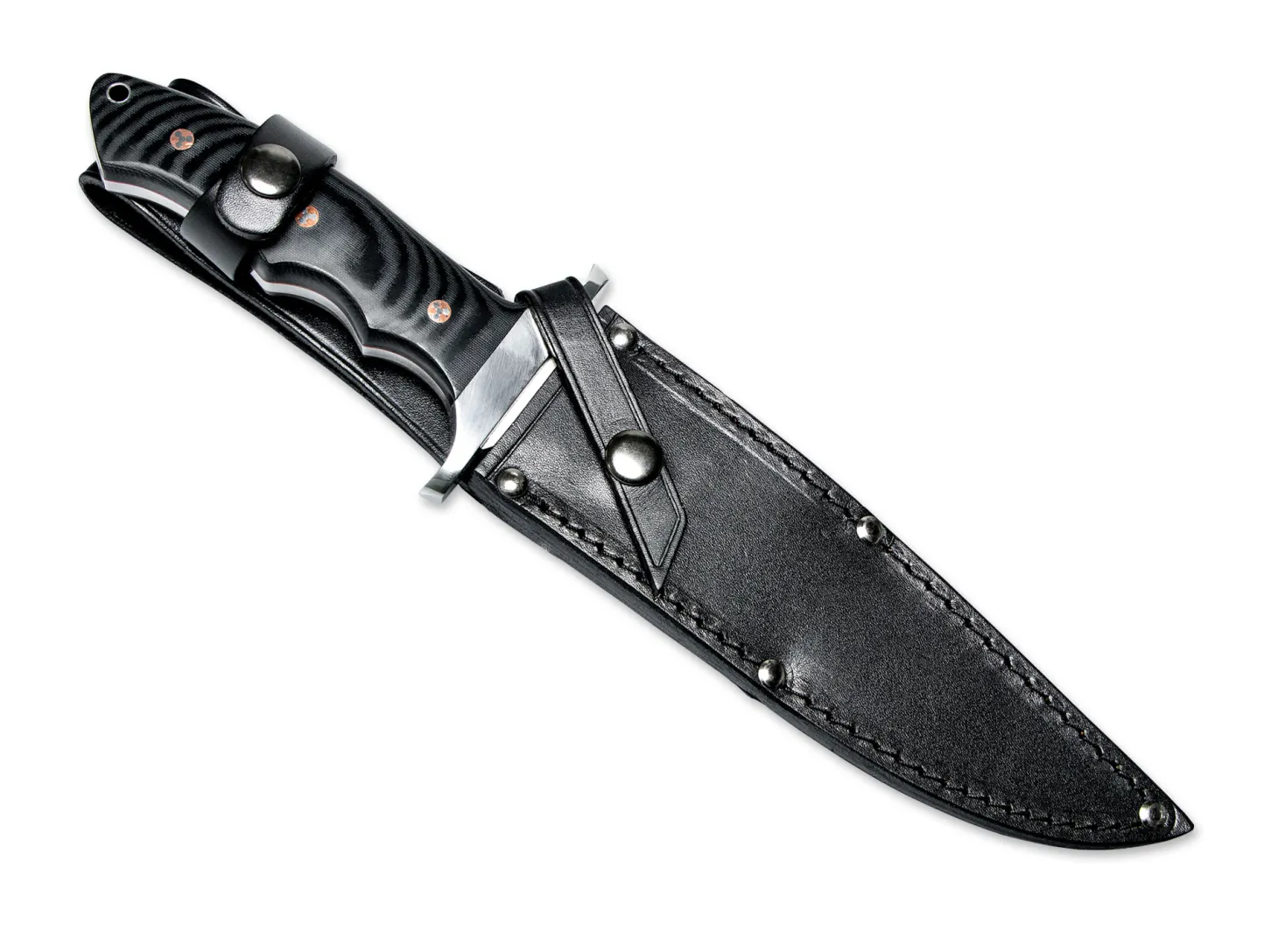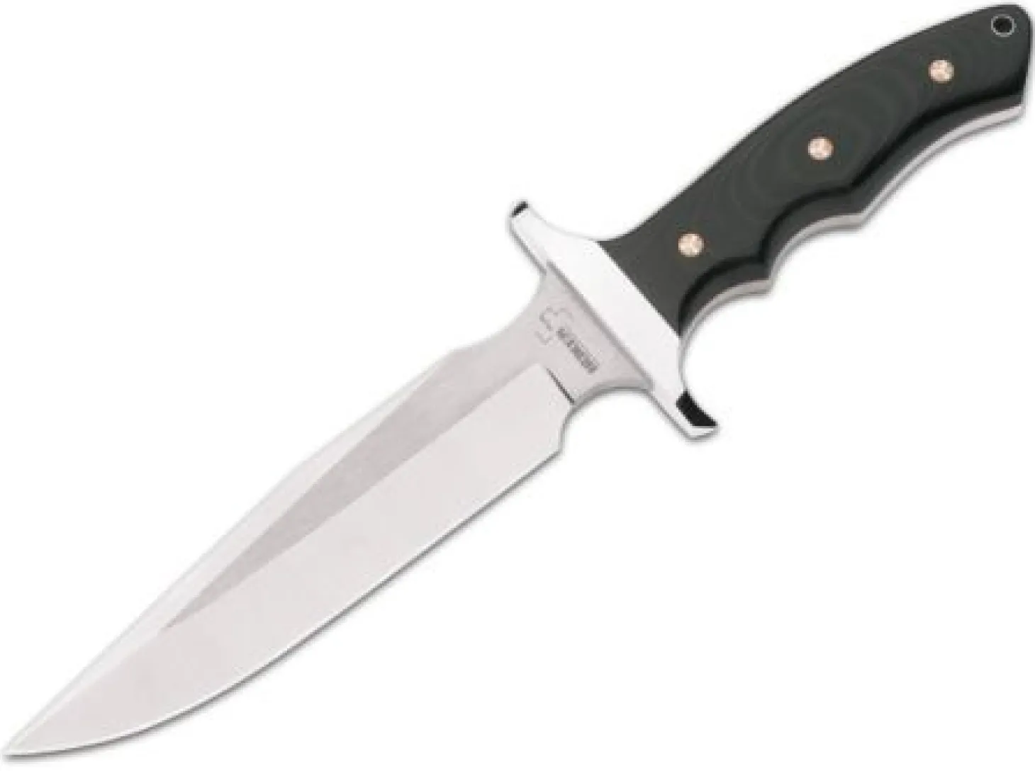 Moderne Interpretation der klassischen Vietnam-Bowies von Böker Plus. Die in zwei Richtungen satinierte Klinge (Two-Tone-Finish) hat eine beeindruckende Stärke von 6 mm und bietet durch den hervorragenden Stahl 440C eine ausgezeichnete Schnitthaltigkeit. Das Parierelement aus Edelstahl bietet den notwendigen Handschutz auch für robuste Anwendungen. Die aufwändig geschliffenen Micarta-Griffschalen sind mit einer roten Fiberlage unterlegt und bieten durch ihre ergonomische Kontur einen angenehmen und sicheren Griff. Die Befestigung der Griffschalen erfolgt über Mosaikpins, die auf Grund ihrer extrem aufwändigen Fertigung sonst nur bei Custom-Knives zu finden sind und dem Messer seine unverwechselbare Note geben. Ein echter Leckerbissen für Sammler. Durch das bewährte Konzept und die robuste Dimensionierung auch als Outdoormesser vielseitig einsetzbar. Inkl. Fangriemenloch. Lieferung mit schöner Sattel-Lederscheide.