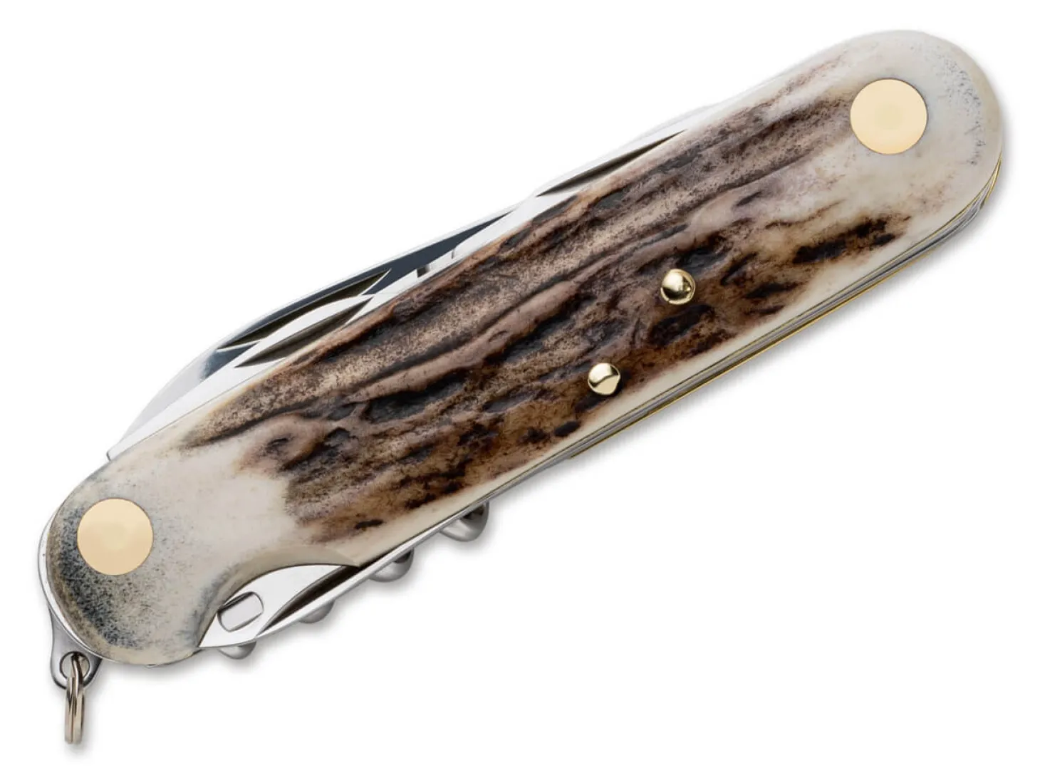Das klassische Multifunktionstaschenmesser ist unverzichtbar für den Alltag und kommt mit edlen Griffschalen aus Hirschhorn. Neben der Hauptklinge aus M390 enthält das Taschenmesser eine kleine Klinge, eine Schere, einen Kapselheber, eine Stechahle, ein Korkenzieher sowie einen Dosenöffner. Der Nagelhau zum Öffnen des Messers sowie der Slipjoint-Mechanismus runden das klassische Gesamtbild ab. Mit hochwertigem Lederetui.