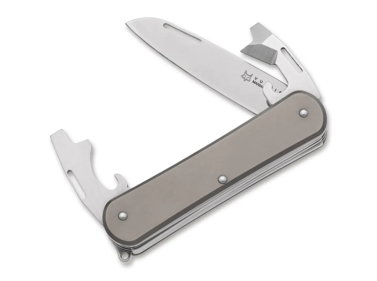 Mit Weisheit, List sowie einer Wharncliffe-Klinge aus M390 samt Kapselheber und Mini-Prybar legt sich das Fox Vulpis für den Verzehr von täglichen Schneidarbeiten auf die Lauer. Das Slipjoint-Messer verriegelt nicht und öffnet klassisch per Nagelhau, welcher als Klingendurchbruch ausgeprägt ist. Moderne Akzente kommen beim Fuchs (lat. Vulpis) im anmutenden Griff aus Titan sowie der praktischen Fangriemenöse zur Befestigung von Lanyards stimmig zum Ausdruck.