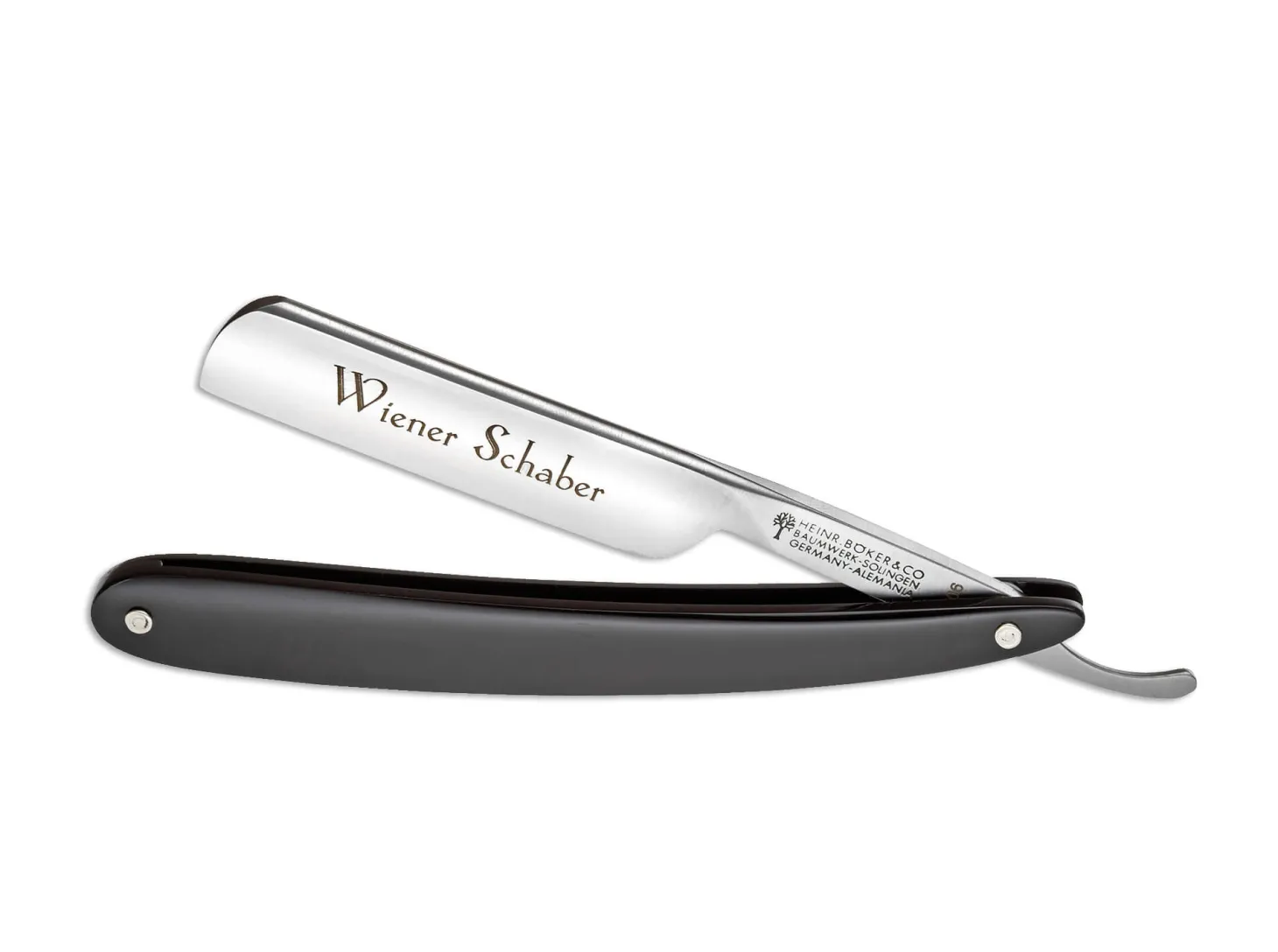 Der Wiener Schaber ist eine besondere Rasiermesserform, die meist als 4/8“ ausgeführt war und durch ihre besonders eleganten und fließenden Linien begeistert. In den Herrensalons der ersten Hälfte des 20. Jahrhunderts vorwiegend zur Bearbeitung von Konturen und zur Nachrasur genutzt, eignet sich der zierliche Wiener Schaber natürlich auch ausgezeichnet zur täglichen Rasur. Aufgrund seiner geringen Größe ist das filigrane Rasiermesser sehr handlich und wendig. Der Wiener Schaber war bereit 1906 fester Bestandteil des Böker Rasiermessersortiments und ist noch heute im Nachdruck des historischen Katalogs zu bewundern.Charakteristisch ist die kurze Klinge mit Französischem Kopf, deren Schneide in einem sanften Bogen in den Erl übergeht und dem Wiener Schaber so sein ganz eigenes Erscheinungsbild verleiht. Die Klinge besteht aus klassischem, nicht rostfreien Kohlenstoffstahl der besonders schnitthaltig ist und wegen seines extrem feinen Gefüges nach wie vor die erste Wahl für hochwertige Rasiermesser ist.Aufgrund der geringen Klingenhöhe des Wiener Schabers ist die hohl geschliffene Klinge als einziges Modell aus unserem Sortiment nicht mit Wall ausgeschliffen. Auslieferung mit Echtheitszertifikat und in historischer Verpackung.