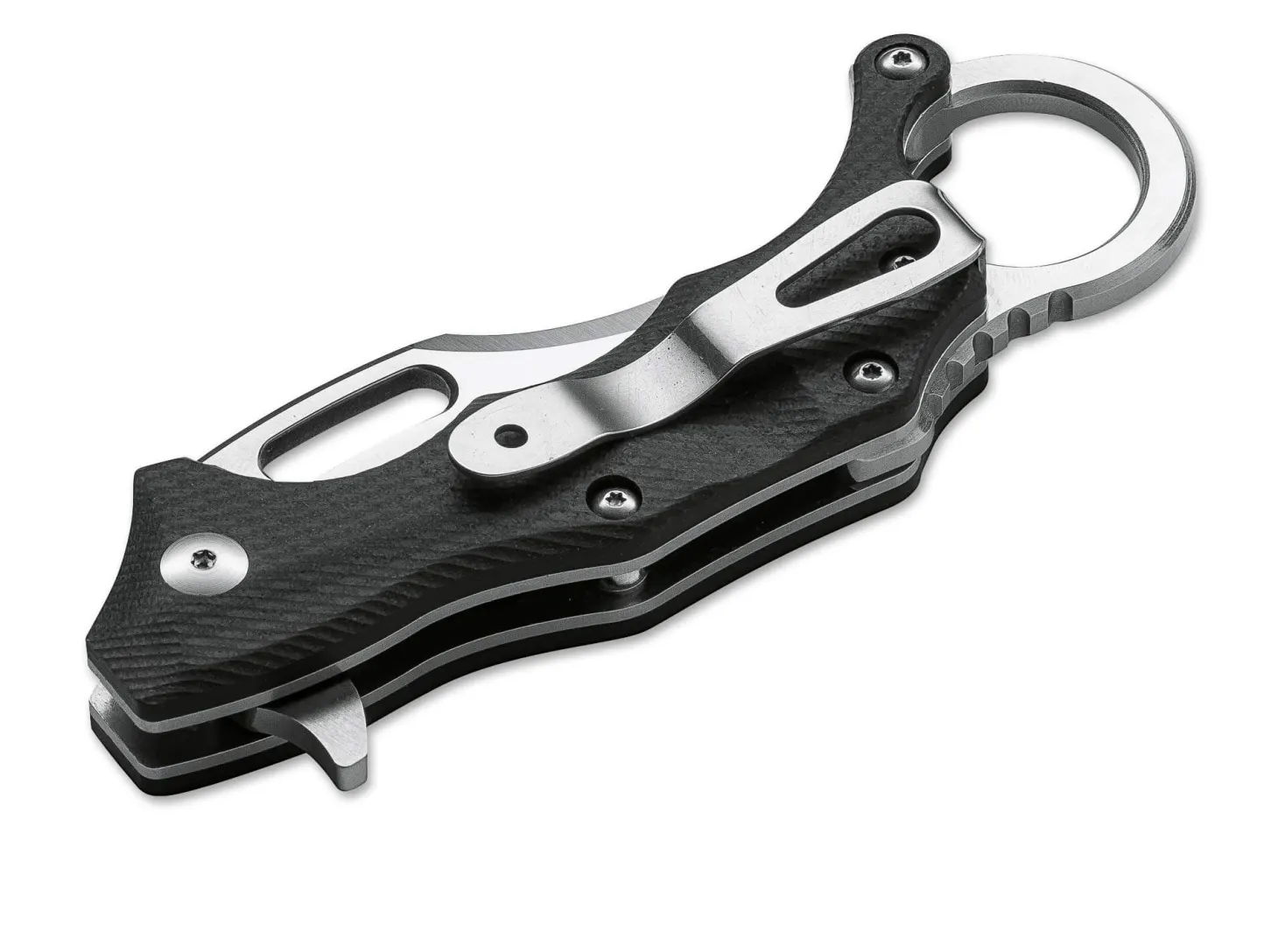 Die Entwürfe von Boris Manasherov zeugen von seinem vielseitigen Background. So ist er nicht nur Ingenieur und ausgebildeter Büchsenmacher, sondern auch Martial Arts-Spezialist, der sich seit 1973 intensiv mit dem israelischen Krav Maga beschäftigt. Seit 1985 als Ausbilder für israelische Spezialeinheiten tätig, vereinen seine Entwürfe seine Erfahrungen aus all diesen Bereichen, und seine Designs sind immer in höchstem Maße praxistauglich und den Erfordernissen moderner Einsatzmesser angepasst. Das exzellente Gespür von Boris Manasherov für die Ergonomie und das Handling eines Messers kommt auch beim Wildcat voll zum Tragen. Das Kerambit überzeugt mit perfekter Handlage und ist mit Edelstahlplatinen und einer Griffbeschalung aus G10 ausgestattet. Die kugelgelagerte Klinge aus D2 wird entweder weich per Daumenöffnung oder schnell und nachdrücklich per Flipper geöffnet. Ein zuverlässiger Linerlock übernimmt die Verriegelung. Der umsetzbare Clip (l/r) sorgt für einen tiefen Sitz in der Tasche, der den Ring jedoch oberhalb des Taschensaumes für ein schnelles Ziehen zugänglich lässt. Mit hochwertigem Nylon-Etui zur Aufbewahrung.
